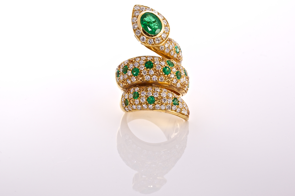 anello in oro giallo, smeraldi,zaffiri gialli e brillanti.
